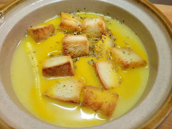 (麵包塊、玉米筍、歐芹碎為額外添加的食材)