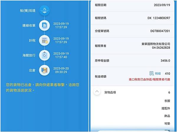 9/15(五)結帳運送▶️9/19(二)入關▶️9/20(三)出關▶️9/21(四)宅配到貨
