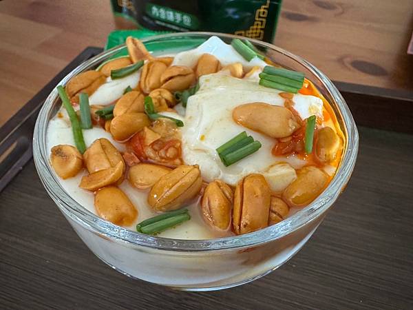 三星蔥花生加入豆花、辣油、醬油、大蒜與鮮蔥~