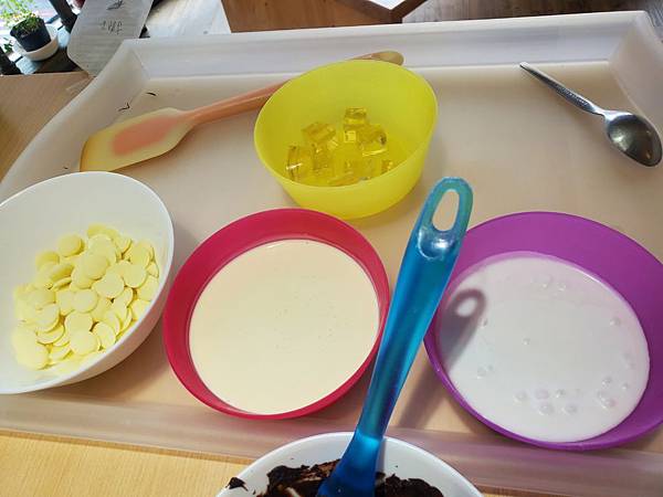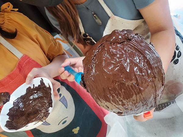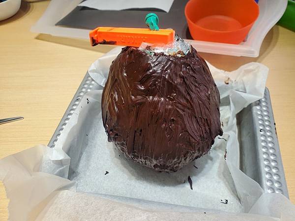 像我巧克力椰子殼立不太起來時,小老師就說可以稍微往下壓一下氣球,這種方便的小撇步建議,然後就放入冰箱冷凍,