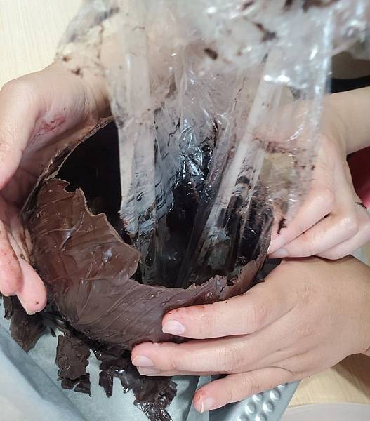 巧克力椰子殼的部分也已經冷凍完成,給氣球消風、剝除保鮮膜,