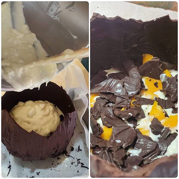 先倒入一半幕斯餡,擺入一半芒果,因為我巧克力塗太上層,為了方便放入內餡只好剝除一些,