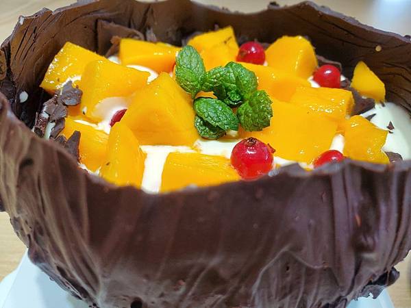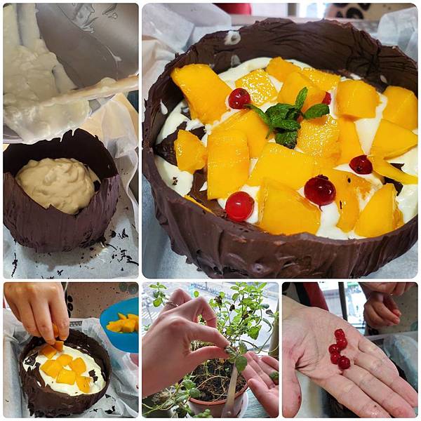 把剩下的內餡倒入、放上所有芒果!!加上妝飾用的小紅果(我忘記正確名稱了)跟薄荷!!