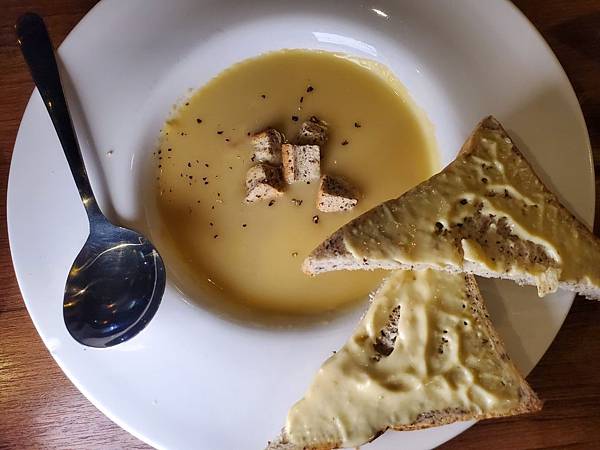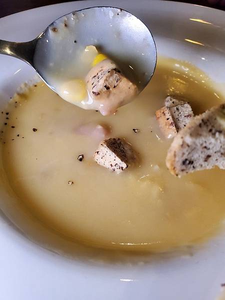 濃湯很濃郁,上面撒上脆脆的麵包丁,湯裡不少料,