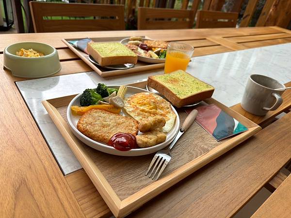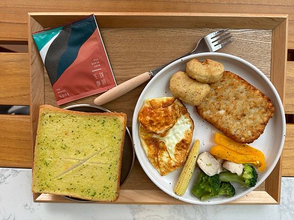 有麵包、煎蛋、薯餅、雞塊與川燙青菜🥦 ~