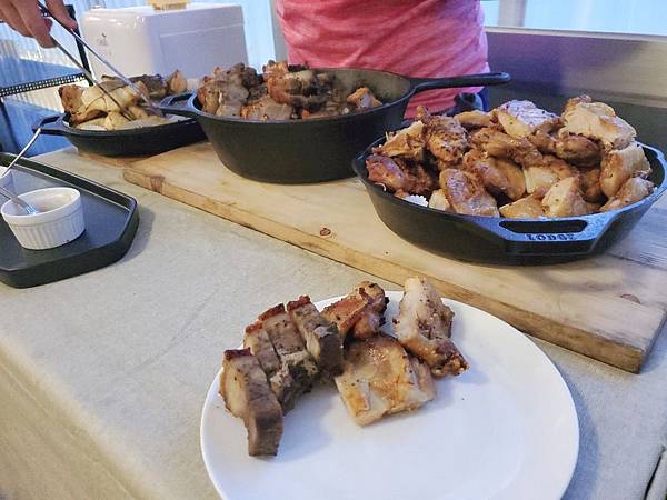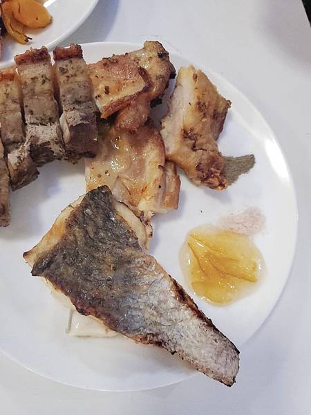 主菜是雞腿排、三層肉、煎鱸魚,另外由服務人員幫忙夾取,