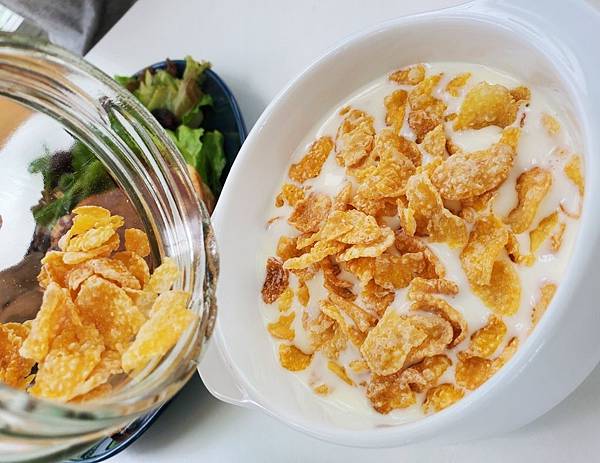 玉米片+鮮奶是經典早餐搭配~雖然飽了但是忍不住還是嘴饞吃了一份XDD