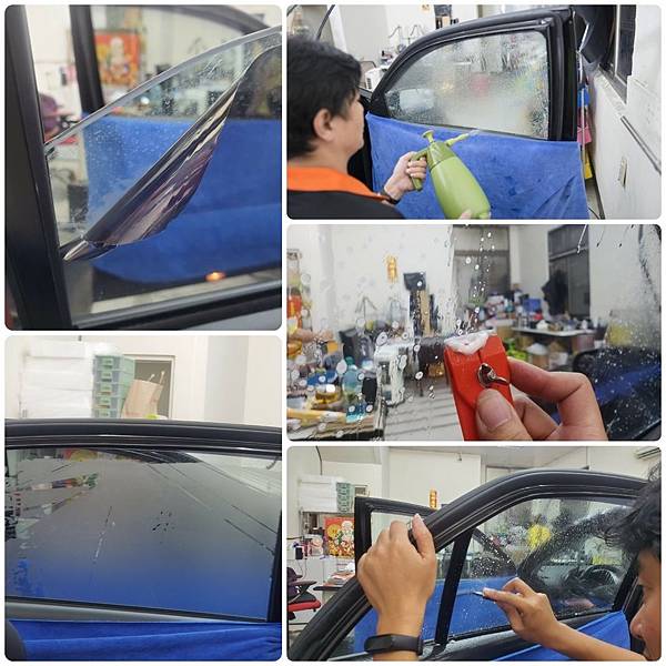 師傅們先撕除原本的隔熱紙,撕除後原本隔熱紙在玻璃上會殘留殘膠,要用水+清潔劑先軟化殘膠後刮除!
