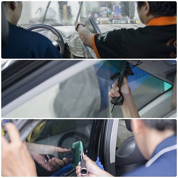 貼上隔熱紙前也要噴一層泡泡水,剛貼上後不可能完全沒有氣泡,師傅們用刮板細心的將氣泡推出,為求完美。