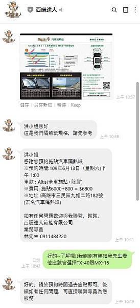 再透過電話詢問用車時間、習慣,細心解釋並建議幾款隔熱紙的特性,也順便做報價,