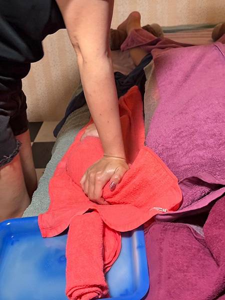 油壓後會用溫熱的毛巾清理多餘的按摩油,