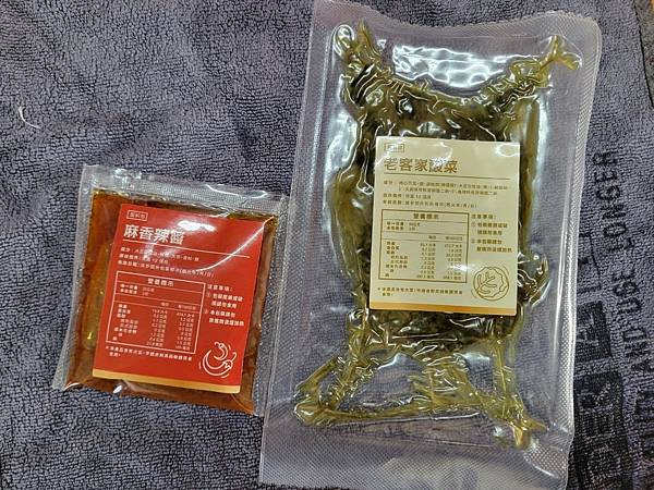 各附一捆關廟麵與真空包裝的🥬酸菜、 🌶️ 麻香辣醬