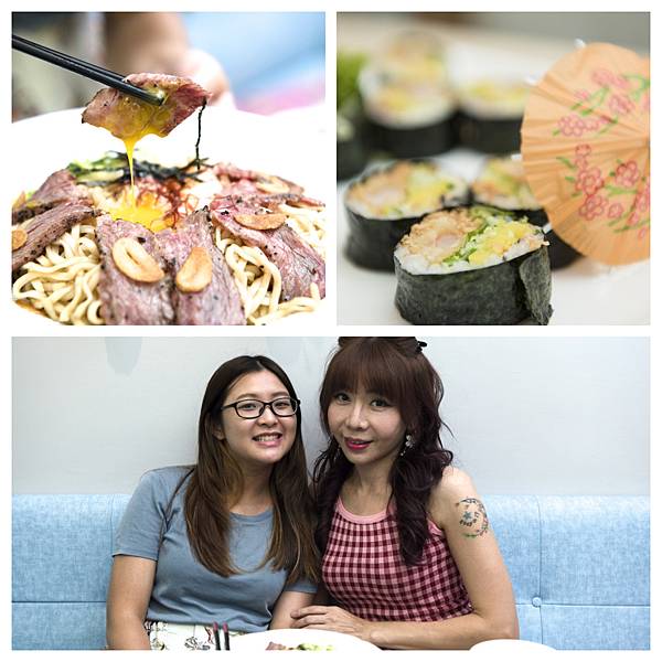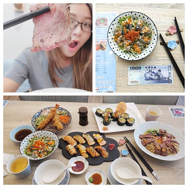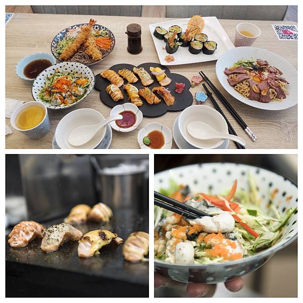 牛奶蚵和風醋沙拉、我愛鮭魚通通有拼盤、蒜香溫泉蛋製燒牛肉冷麵,1樣沙拉+兩樣冷麵食主食+兩份不同的壽司~