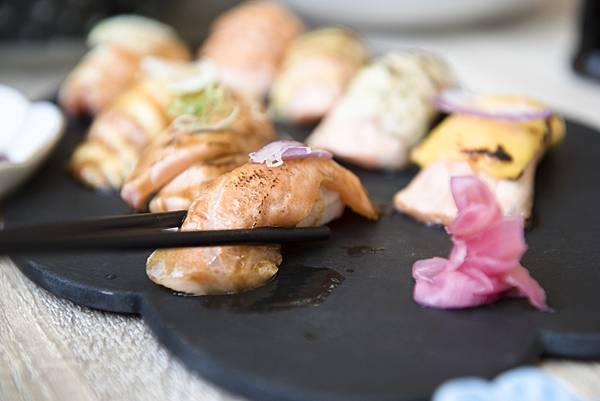 他們的鮭魚很新鮮、油脂豐厚,炙燒過的鮭魚油脂特別香,夾起壽司石板上都還有鮭魚本身的油脂印章,