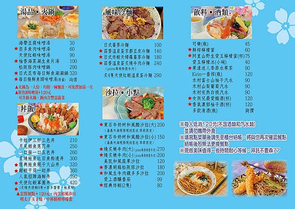 現場有季節性的限量生魚片,有黑鮪魚次身與綜合生魚片,也能品嘗到鮭魚味噌湯及鯊魚肚湯。