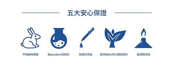 絕對不做動物實驗、無paraben防腐劑、無添加香料、無添加MI/MCI類防腐劑、無添加酒精