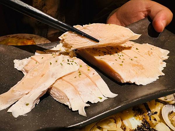 舒肥油蔥雞淡淡的調味與多汁鮮嫩、如生魚片般滑嫩細緻的口感,