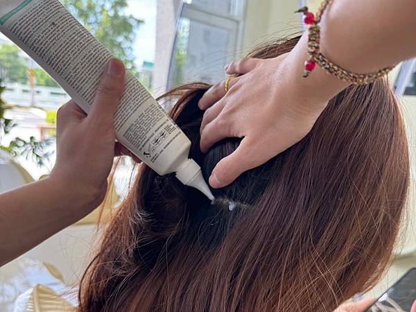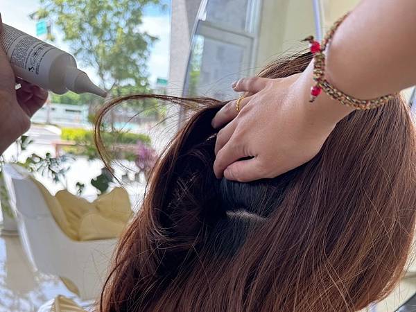 接著乾髮點塗頭皮卸妝,撥開髮絲、層層點塗,