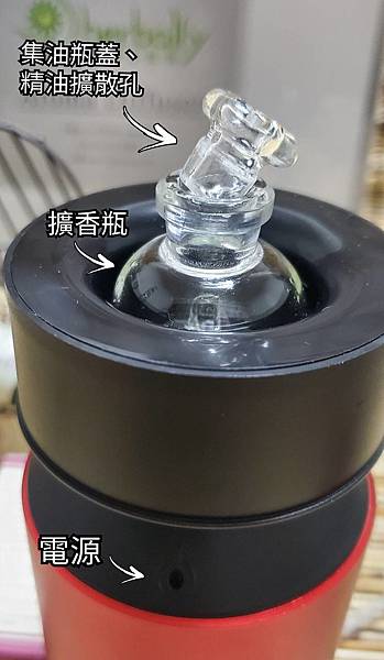 再來介紹構造與使用方法:上方蓋子打開後,可以看到有一個小洞的集油蓋、擴香瓶、