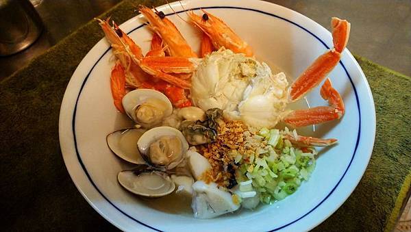 菜單也很簡單!就只有海鮮粥!!可以看得出一般沒加料的就有蝦、蛤蜊、蚵仔、螃蟹、花枝好幾種食材了!!還可以選擇+50元加料-特級草蝦或是鮑魚!!!