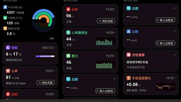可以感測心律 ❤️ 、手部溫度 🌡️ 、步數 🦶 、睡眠質量 🛏️ 、壓力 😱 、血氧,