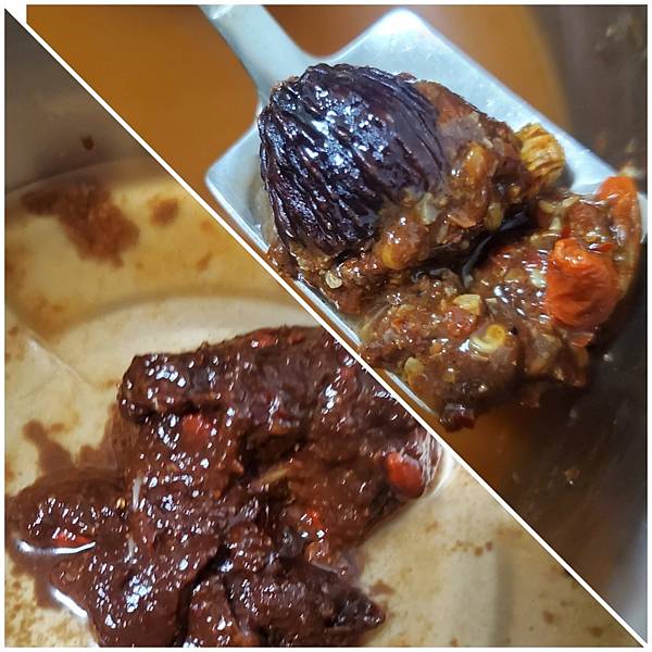 倒出來時能看到醬汁是濃稠的膏狀,而且裡面有很多中藥、香料的細碎顆粒在內!!