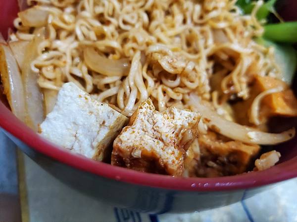 豆腐都已經切成好入口的小塊,加一點青菜例如洋蔥、高麗菜均衡一下!
