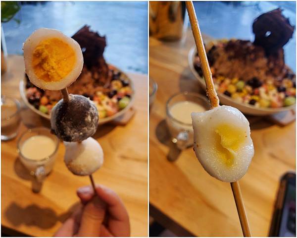 第一顆是鹹蛋黃口味,鹹蛋黃鹹甜鬆鬆+麻糬Q彈微甜