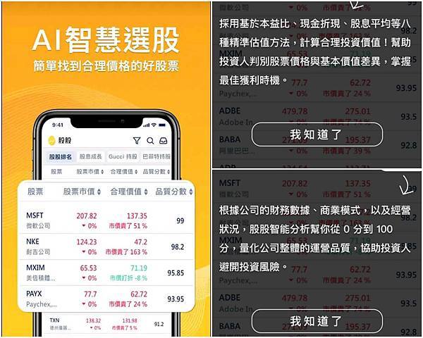 股股學院也有推出APP,APP操作業面簡單明瞭列出股票合理價值、品質分數
