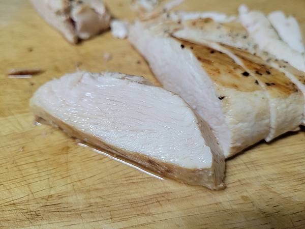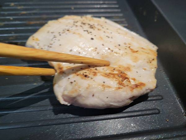雞胸肉乾煎時翻面有柔韌回彈的感覺,能感受到雞肉的扎實、Q彈,