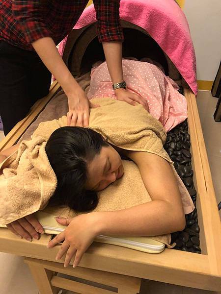 岩盤浴的最後10分鐘會換成趴臥,用餘溫稍微溫暖腸胃以及子宮,