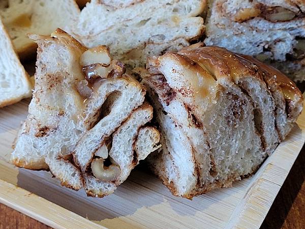 濕潤又香氣十足的肉桂捲,入口還有核桃果粒增加香氣與口感;