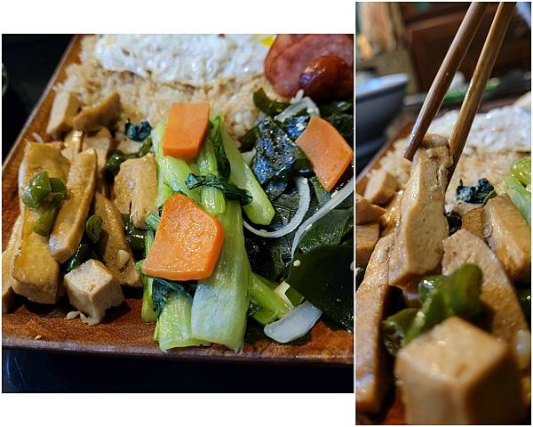 三色小菜能均衡營養、解膩,喜歡這道炒豆干,豆干的孔洞吸附著醬汁;
