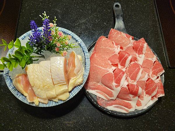 贈送的肉也超大方💯,梅花豬整盤擺好擺滿、無骨雞腿比手掌還大!!