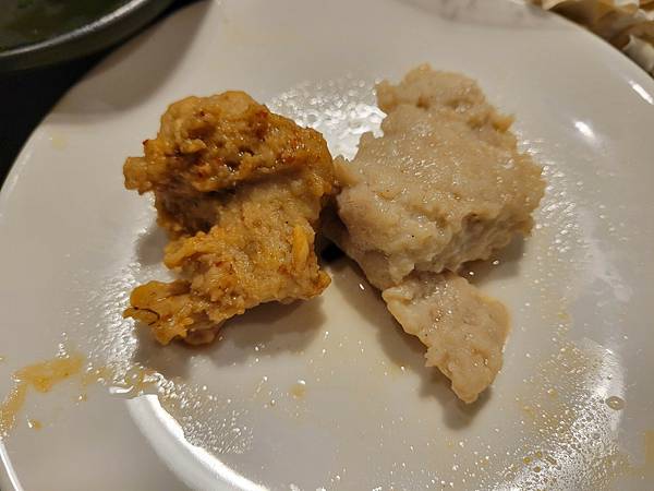 湯頭真的超濃郁,食材一煮就入味!左邊的是火焰麻辣鍋的虱目魚漿、右邊的是花雕雞的魚漿,