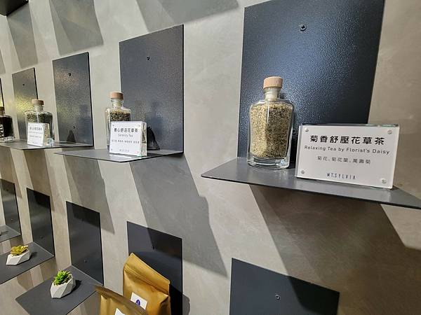 牆上放著各種茶葉/花草茶的罐子,並詳細介紹內含的香草🌿種類,
