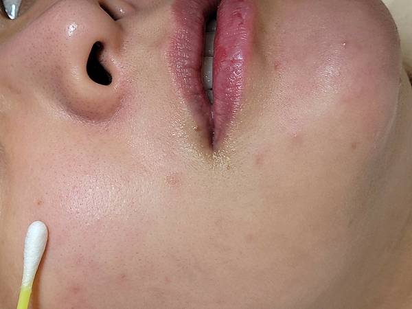 黑頭粉刺、下巴痘、痘疤,兩邊鼻翼紅養、有輕微的毛囊炎現象