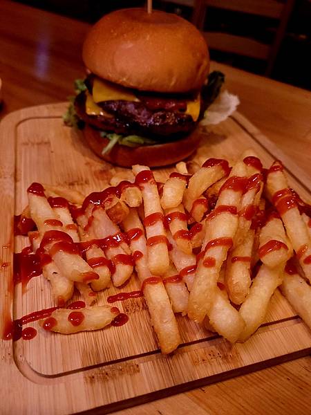 漢堡有附小份薯條,吃起來很刷嘴、配啤酒很對味!